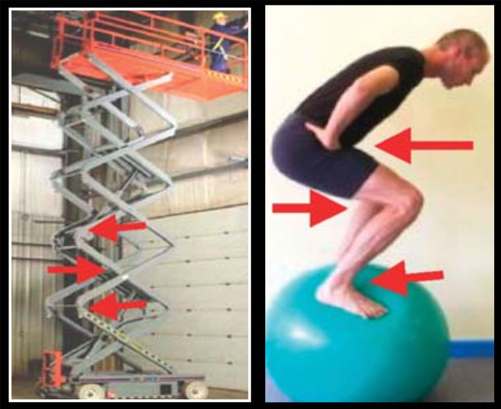 Motions of the hip, knee, and ankle/MTP joints act in the opposite direction from the one directly above or below it. For example, when an individual squats, the ankle and hip flex in the reverse direction of the knee. This is analogous to the motions of a scissor jack. Each of the hinges flex in opposite direction to one another. Should one of these hinges be fused, then motion within the entire jack will cease. This is because these motions are interdependent. Considering that the linkage of the LE is identical to the scissor jack, then loss of motion in one joint will have to negatively impact the others.