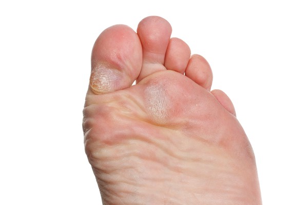 Corns and calluses are protective layers of compacted, dead skin cells. They are caused by repeated friction from skin rubbing against bony areas or against an irregularity in a shoe. Corns ordinarily form on the toes and calluses on the soles of the feet. The friction and pressure can burn or otherwise be painful and may be relieved by moleskin or padding on the affected areas. Corns and calluses can also occur when there is a bio-mechanical problem with the foot.